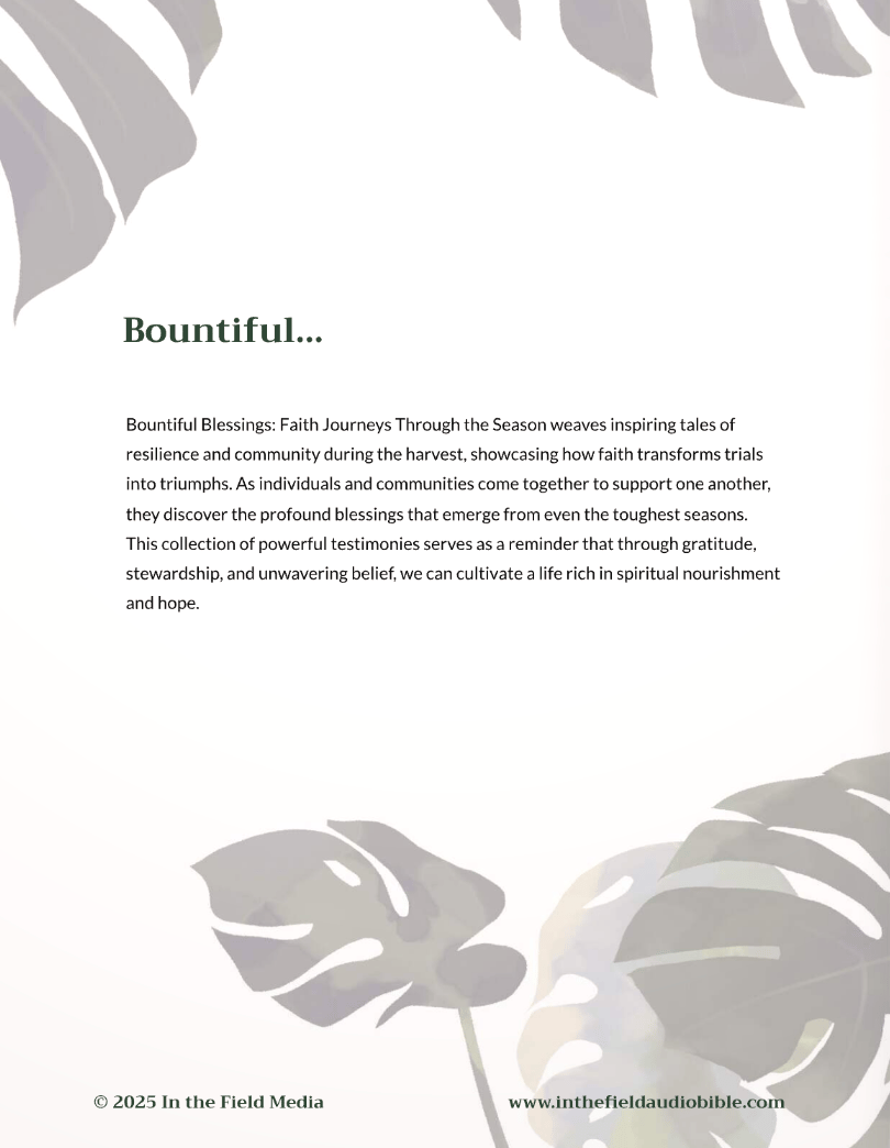 Step into a journey of gratitude and discover how every season of life overflows with divine blessings waiting to be unveiled. "Bountiful Blessings: Faith Journeys Through the Season" is a transformative devotional that will guide you through inspiring stories of God's faithfulness, provision, and love in every circumstance.